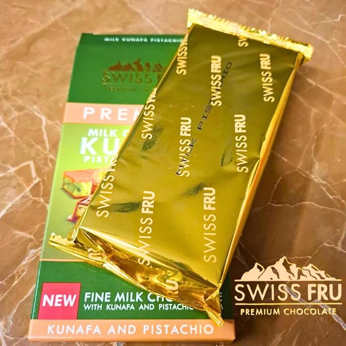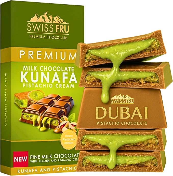 Savourez le luxe fondant du chocolat au kunafa de Dubaï : une pâte croustillante, un chocolat au lait crémeux et un cœur de crème de pistache onctueux pour une bouchée irrésistible.